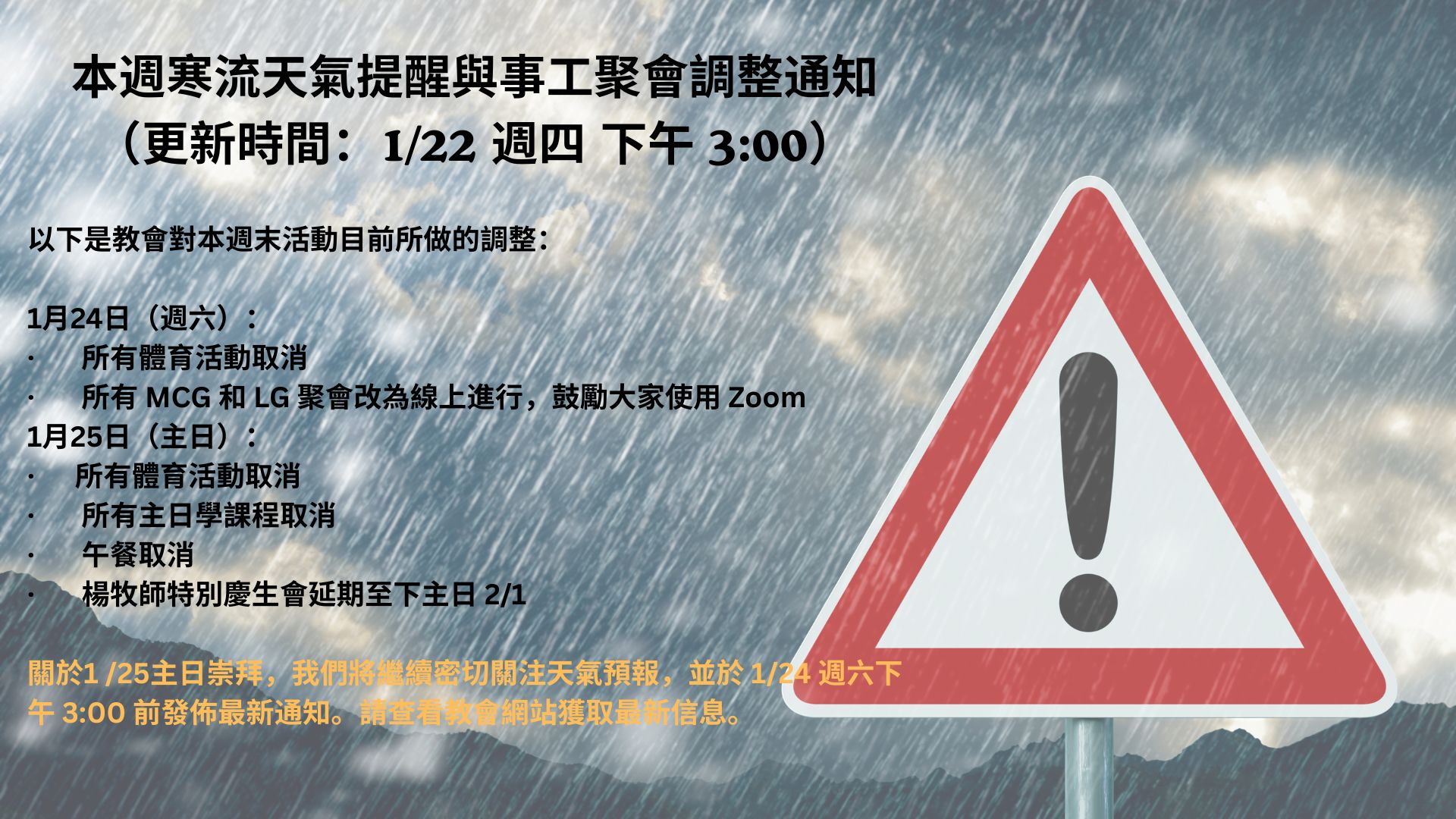 1 /25主日崇拜,我們將繼續密切關注天氣預報,並於 1/24 週六下午 3:00 前發佈最新通知。